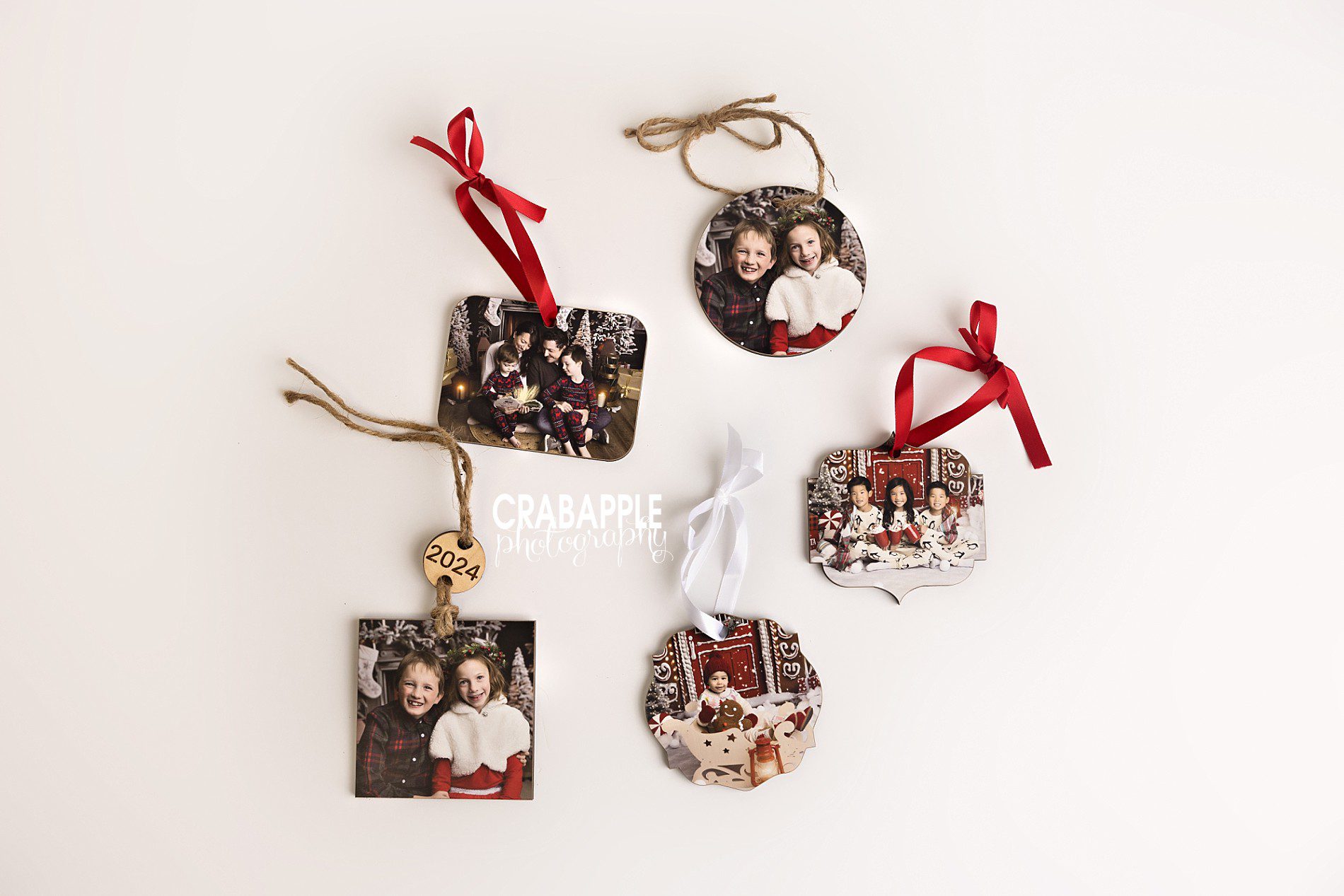 Choose from a variety of classic and festive shapes from timeless circles and rectangles to holiday inspired designs. Each ornament is finished with your choice of red, green, or white ribbon, or a rustic jute twine for a cozy, farmhouse feel.